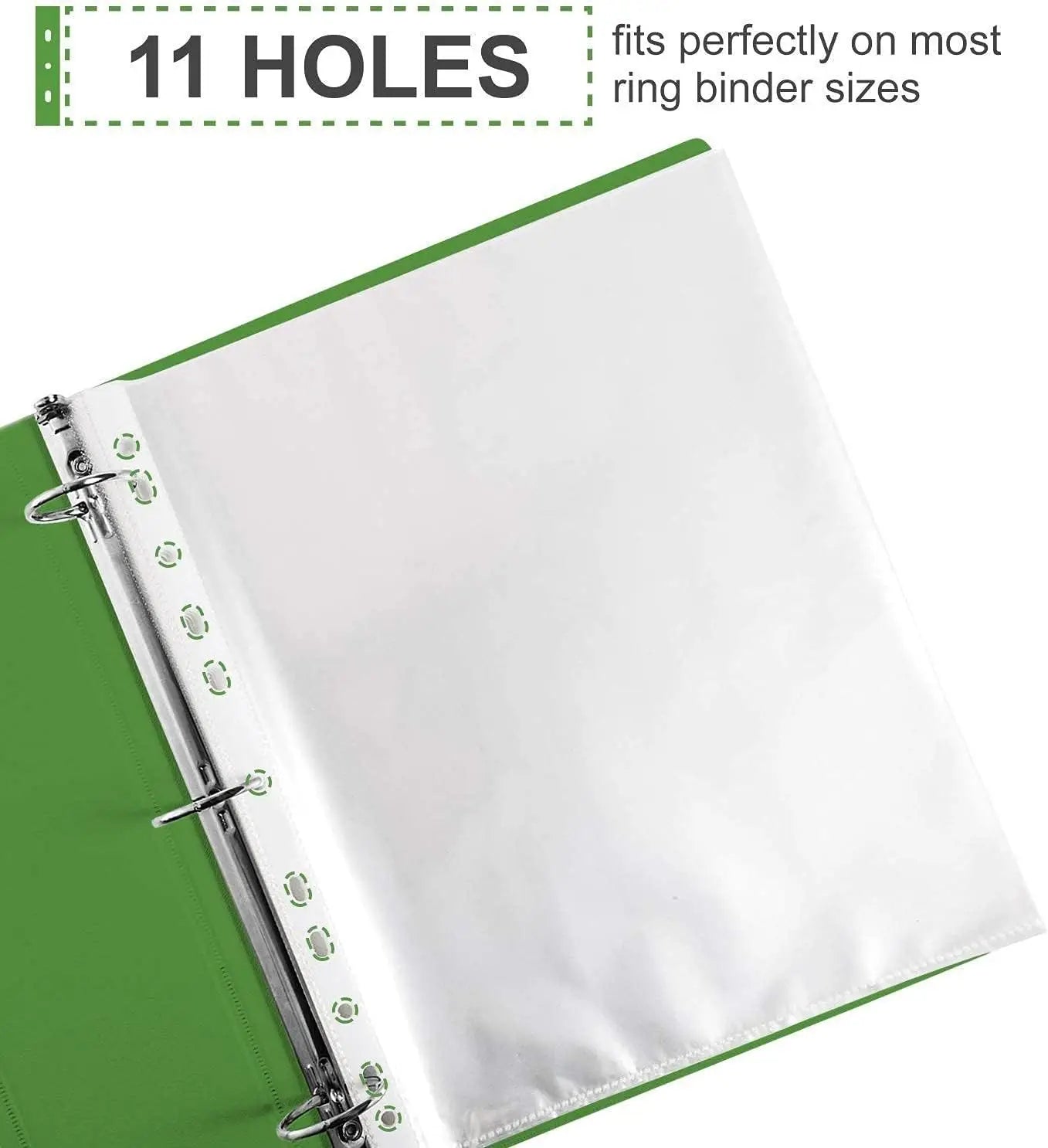EASY TO USE - Top loading 9.25 x 11.25 inch sheet protectors with 11 holes fit 8.5 x 11 inch papers and will keep your standard letter sized papers safe in the most ring binders, paper binders, folders or similar office products.